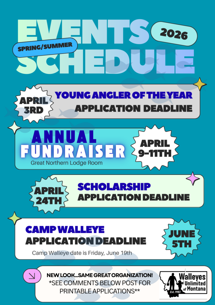 We invite you to our Annual Fundraiser held April 9th – 11th at the GN Lodge Room. Malta Chapter Members will be there manning the silent auction, bucket drawings, gun raffle, 50/50, and kids table Thursday and Friday, 5-8, and Saturday, 4-7. You can purchase your membership in advance online at https://montanawalleyesunlimited.net/register/walleyes-unlimited-annual-membership/ or we can help you at the fundraiser, renew or start a new membership. Dine in or take out Tom’s Fish Special to top off the fun!