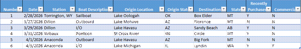 • Inspection data from the 2026 season will be available on the Watercraft Inspection Dashboard in early April:  https://experience.arcgis.com/experience/e7e5c01c253741bb88af3a963940c92d